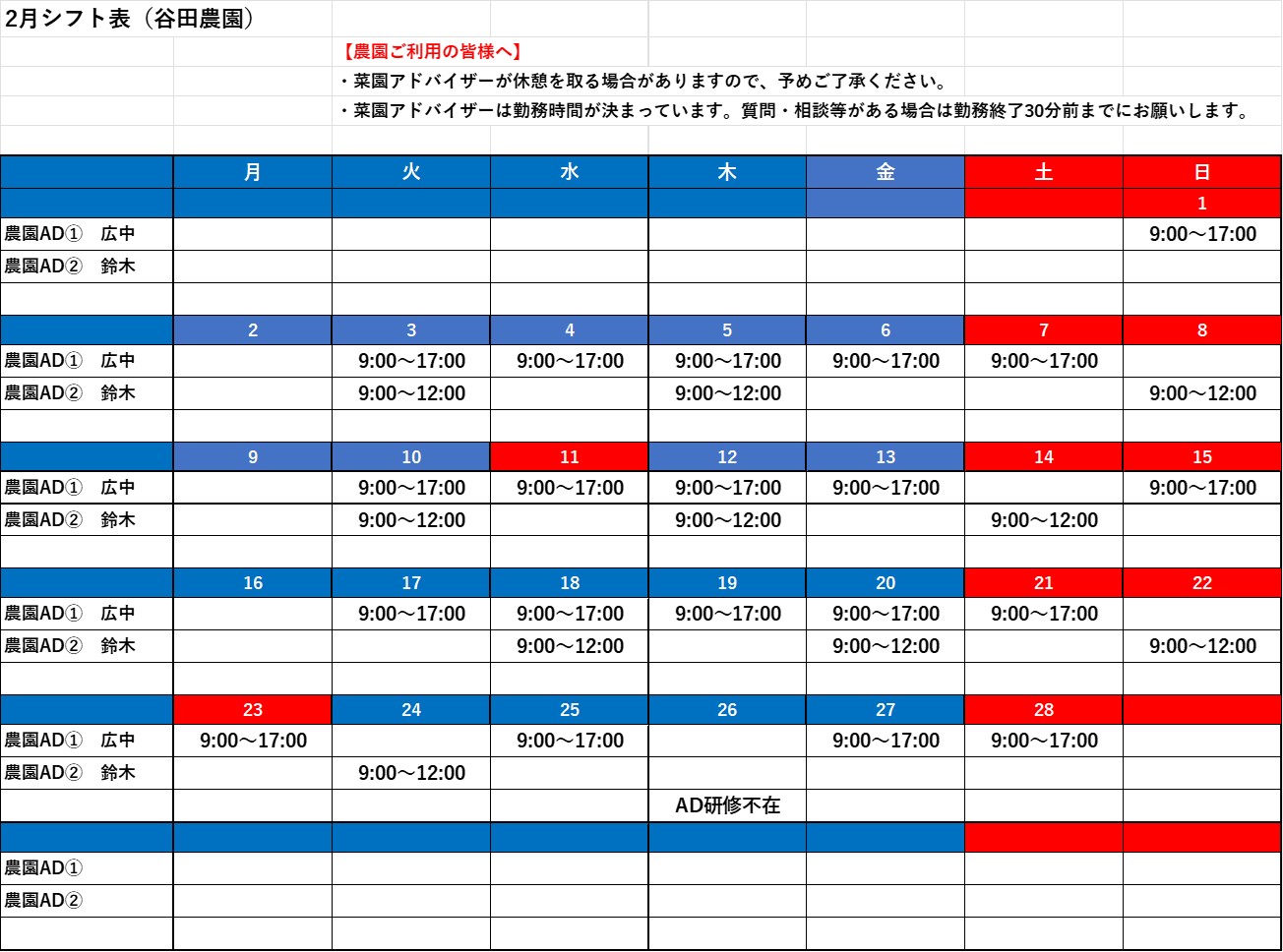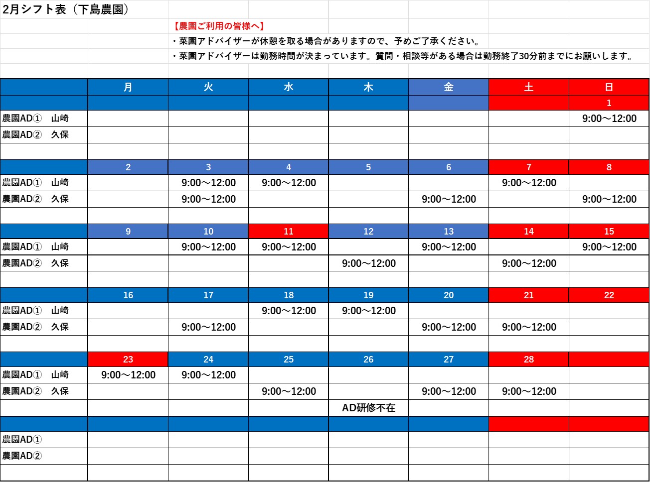 2026年2月の菜園アドバイザー勤務予定