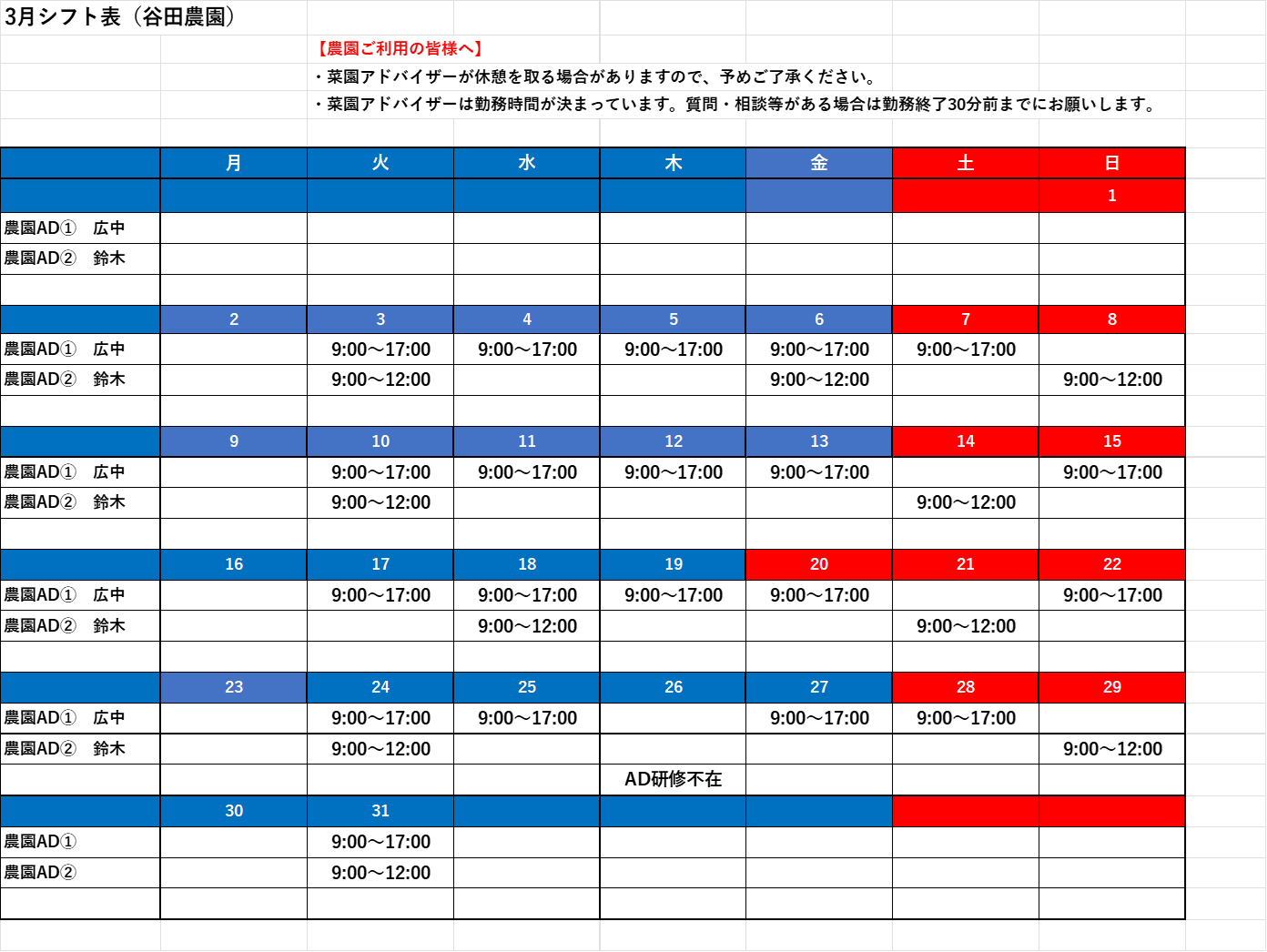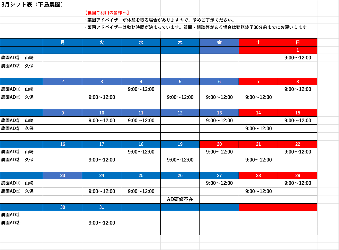 3月の菜園アドバイザーの勤務予定を公開いたします。