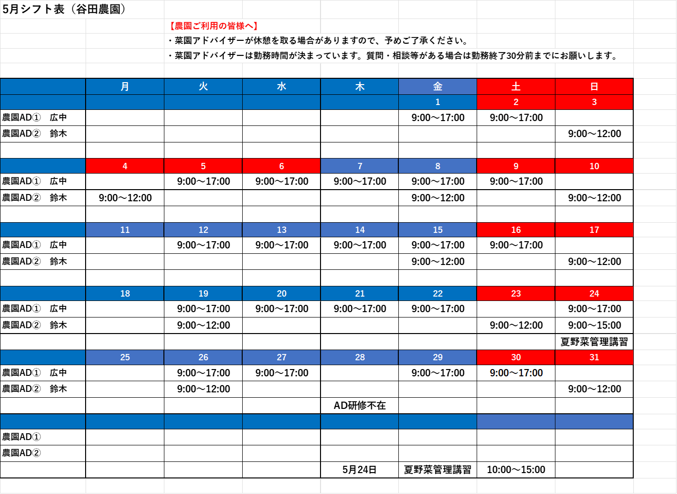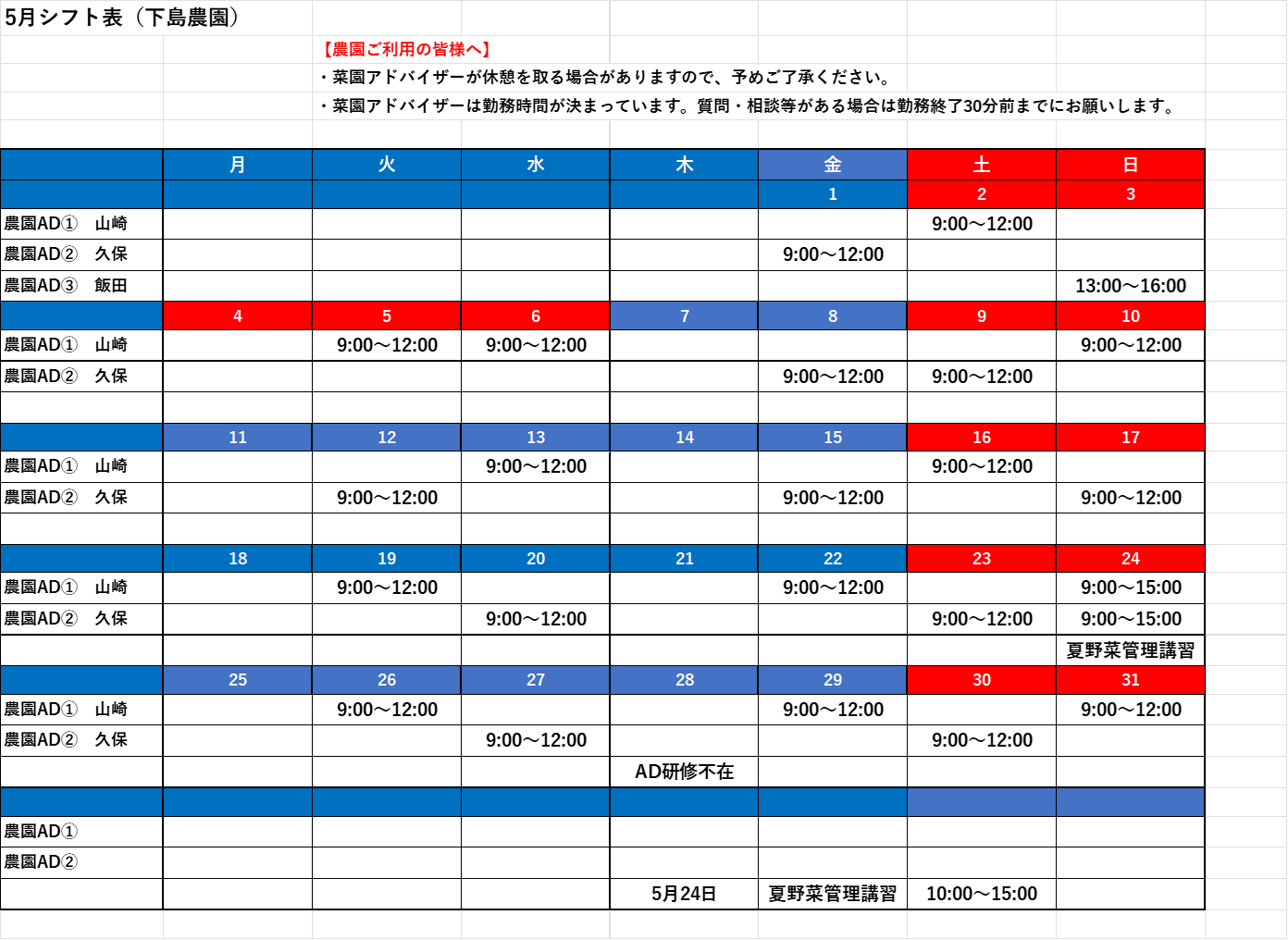 いつもみんなのはたけをご利用いただきありがとうございます。5月の菜園アドバイザー勤務予定を公開いたします。